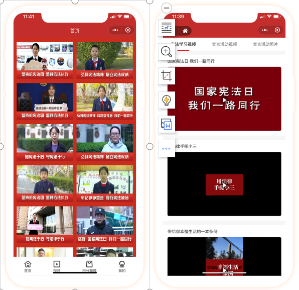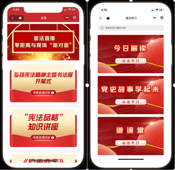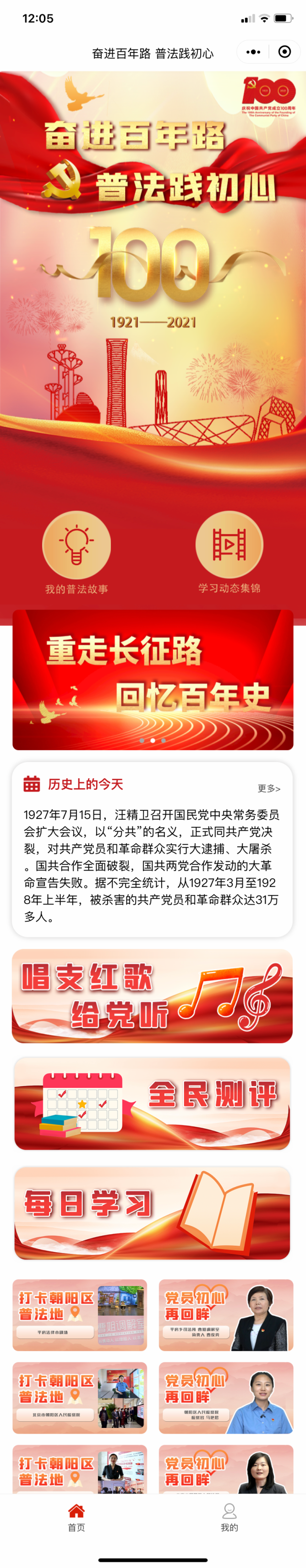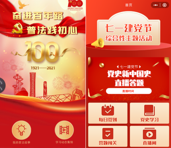 小程序以“普法+党史”的创新形式,通过对宣传内容进行清晰的版块划分。