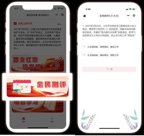 2. 在全民评测版块中采用了互动答题功能,让用户对学“全民测评”、“每日学习”等答题学习活动,另外再融合抽奖可帮助提高用户参与积极性;到的知识进行评测,当用户达到分数条件即可获得不同级别证书,激励用户学习热情。