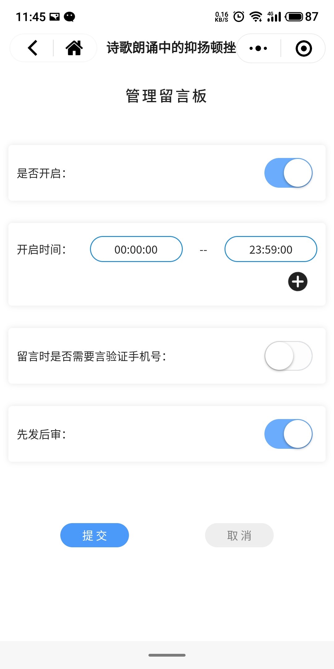 留言支持设定支持的留言形式,包括视频、音频、图片、文字。