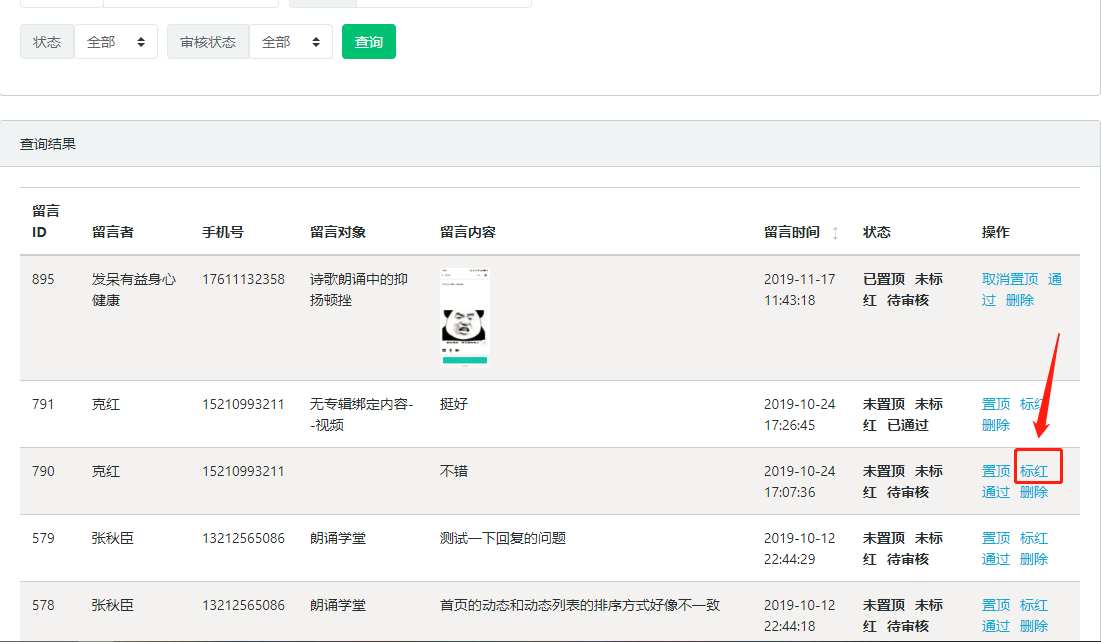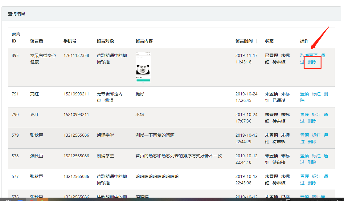 标红效果展示图6.留言删除:进入留言列表页面后,点击“删除”,可将该条留言的状态修改为已删除,删除留言后,该条留言将无法在小程序页面中展示,如图所示: