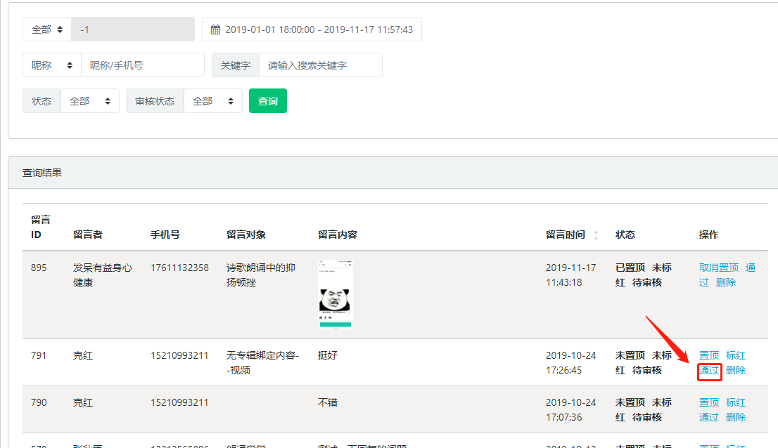 4.留言审核:进入留言列表页面后,点击“通过”可将该条留言的审核状态修改为已通过,若当前留言板的展示模式为“先审后发”,则只有审核状态为通过的留言才会展示在小程序中,如图所示: