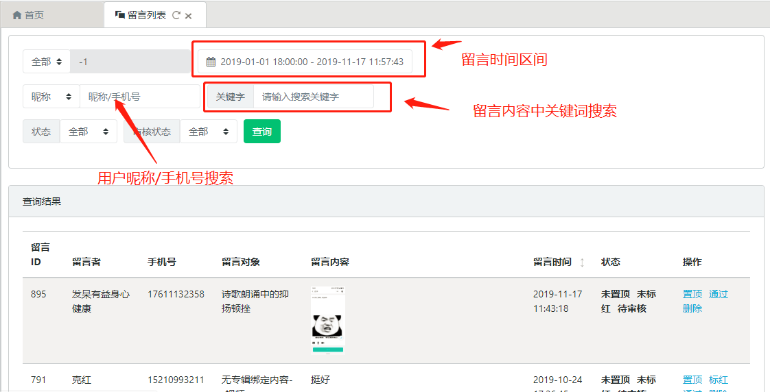 2.留言检索:进入留言列表页面后,可在搜索区域输入相应的条件查询出该搜索条件下的留言内容,如图所示: