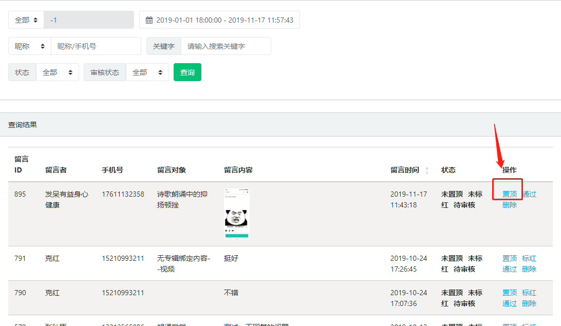 置顶效果展示图4.留言审核:进入留言列表页面后,点击“通过”可将该条留言的审核状态修改为已通过,若当前留言板的展示模式为“先审后发”,则只有审核状态为通过的留言才会展示在小程序中,如图所示: