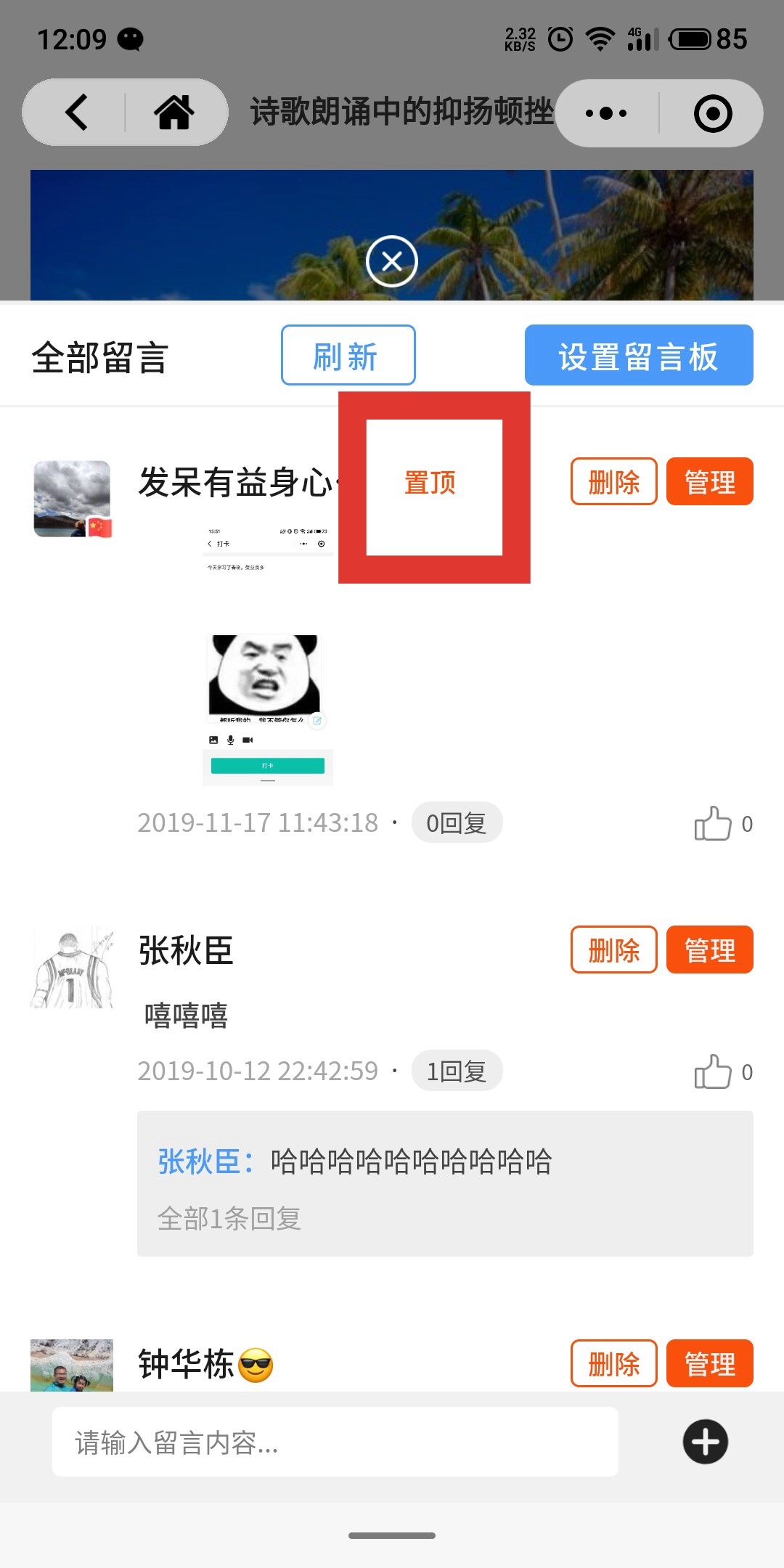 3.留言置顶:进入留言列表页面后,点击“置顶”可将该条留言在小程序中的留言列表中置顶,并带有置顶标识,如图所示:
