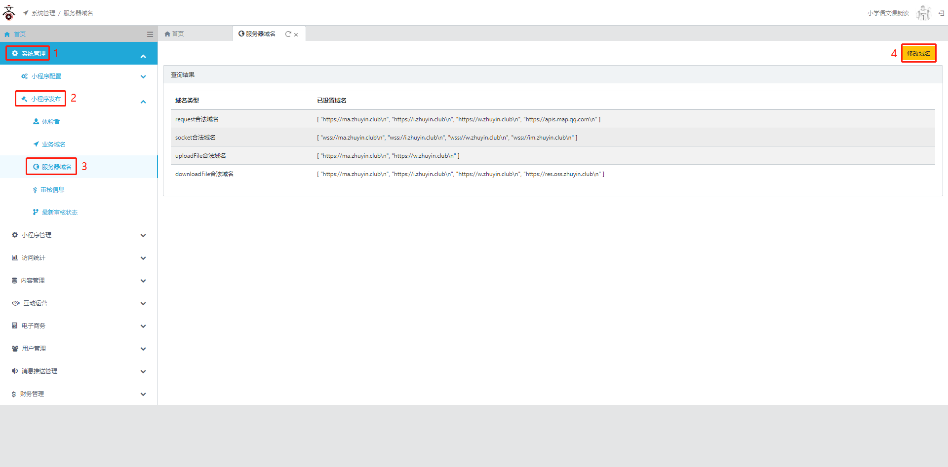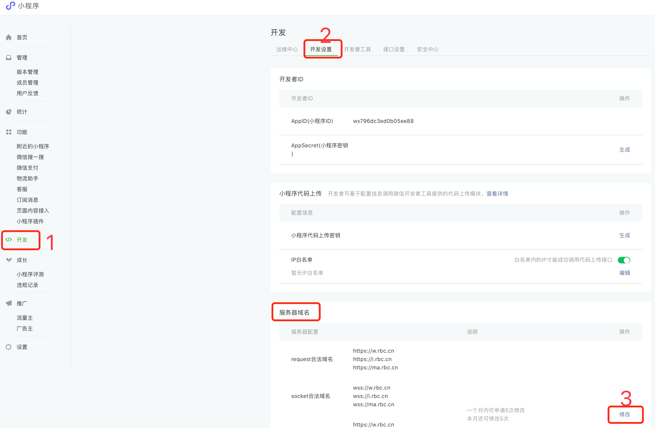 如果小程序需要通过用户授权地理位置,来解析用户所在省市,则需要在微信后台(mp.weixin.qq.com)中,在“开发—开发设置”中,找到“服务器域名”,点“修改”,如下图: