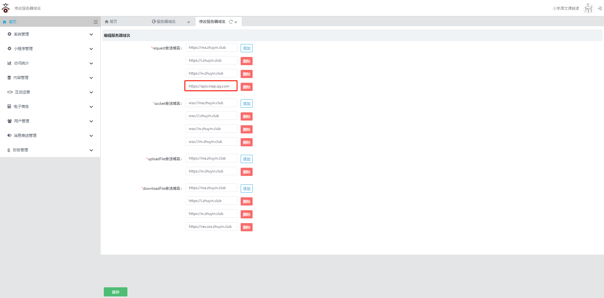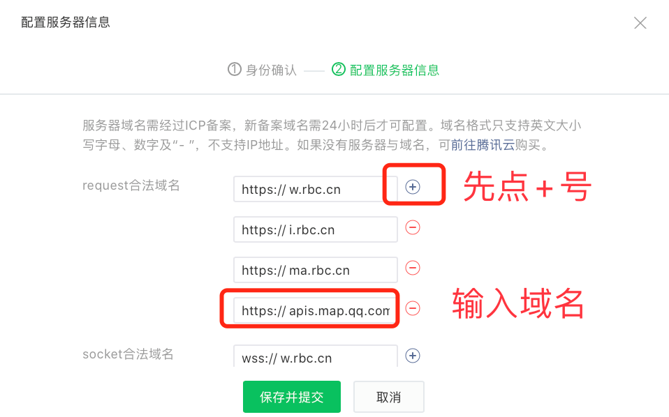 将上述域名(https://apis.map.qq.com)添加到“request合法域名”中,保存即可。