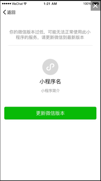 如果用户基本库版本低于您的设置,用户打开小程序时会出现让用户更新微信版本的提示。