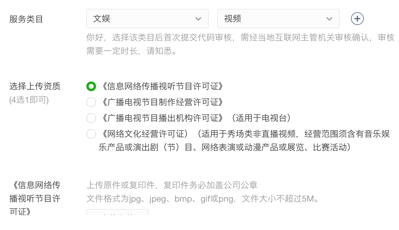 4.文娱-视频:此分类建议有电视台节目直播及以视频播出为主的小程序选择添加。需要资质如下图: