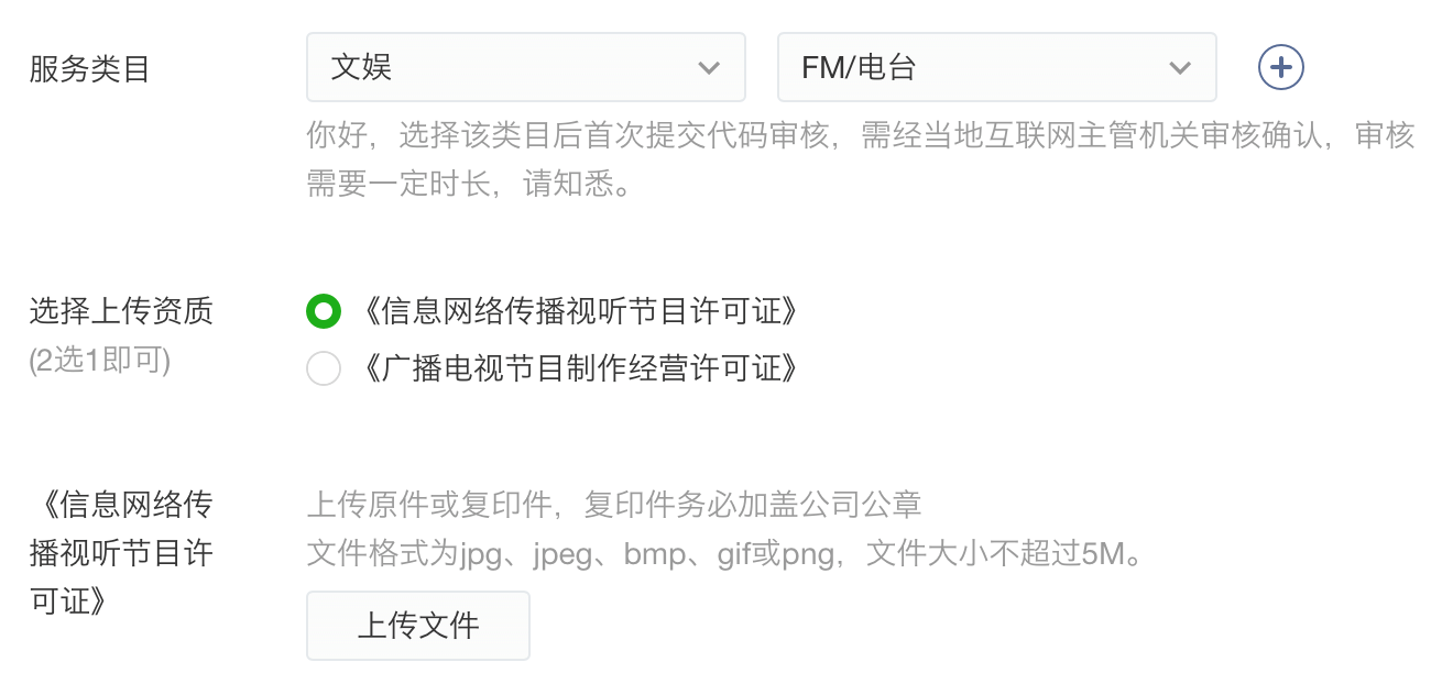 3.文娱-FM电台:此分类建议有电台节目直播的小程序选择添加。需要资质如下图: