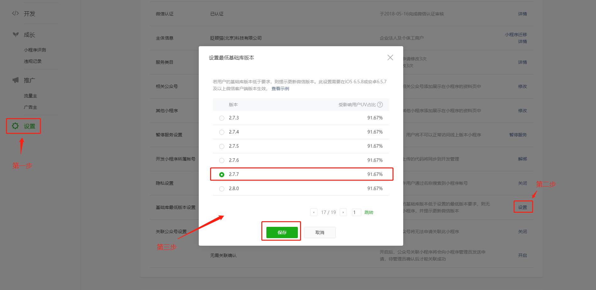 填写完小程序基本信息后,需要设置一下基础库版本,设置位置如下图所示。