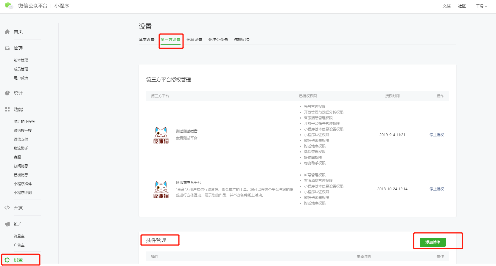 ✦左侧菜单寻找“设置”,然后找到第二项“第三方设置”,找到“插件管理”,点击右侧的“添加插件”。如下图所示: